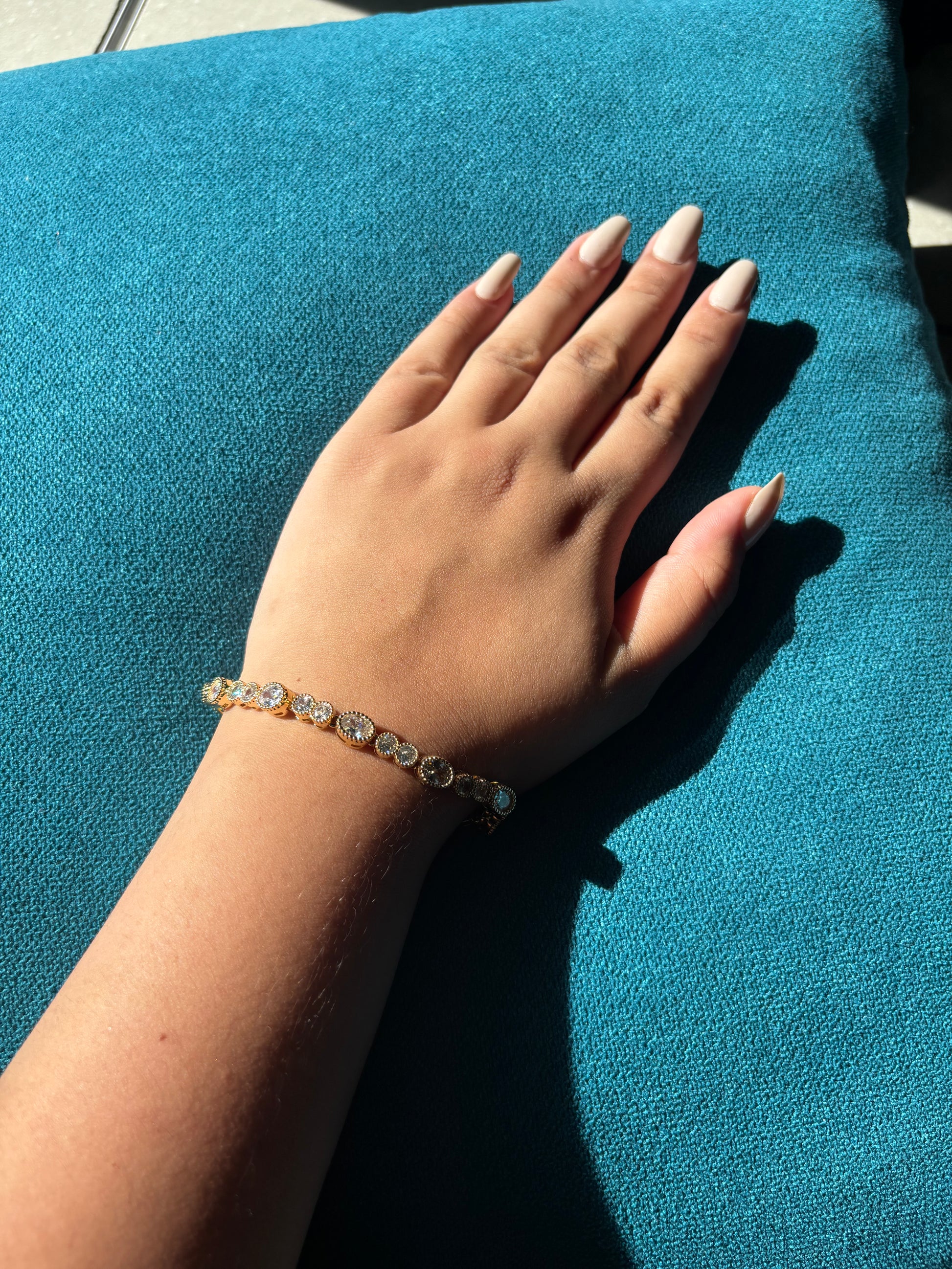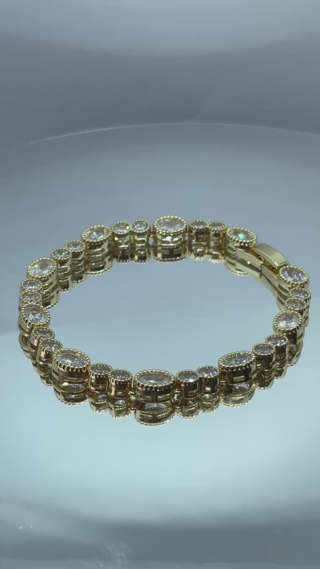 This Diamanté Gold Ovals Bracelet features 18K gold-plating, cubic zirconia, and a single diamond, creating a luxurious and timeless piece of jewelry. The high-quality materials make for a durable and eye-catching bracelet that will elevate any outfit. Add a touch of elegance to your wardrobe with this stunning bracelet.