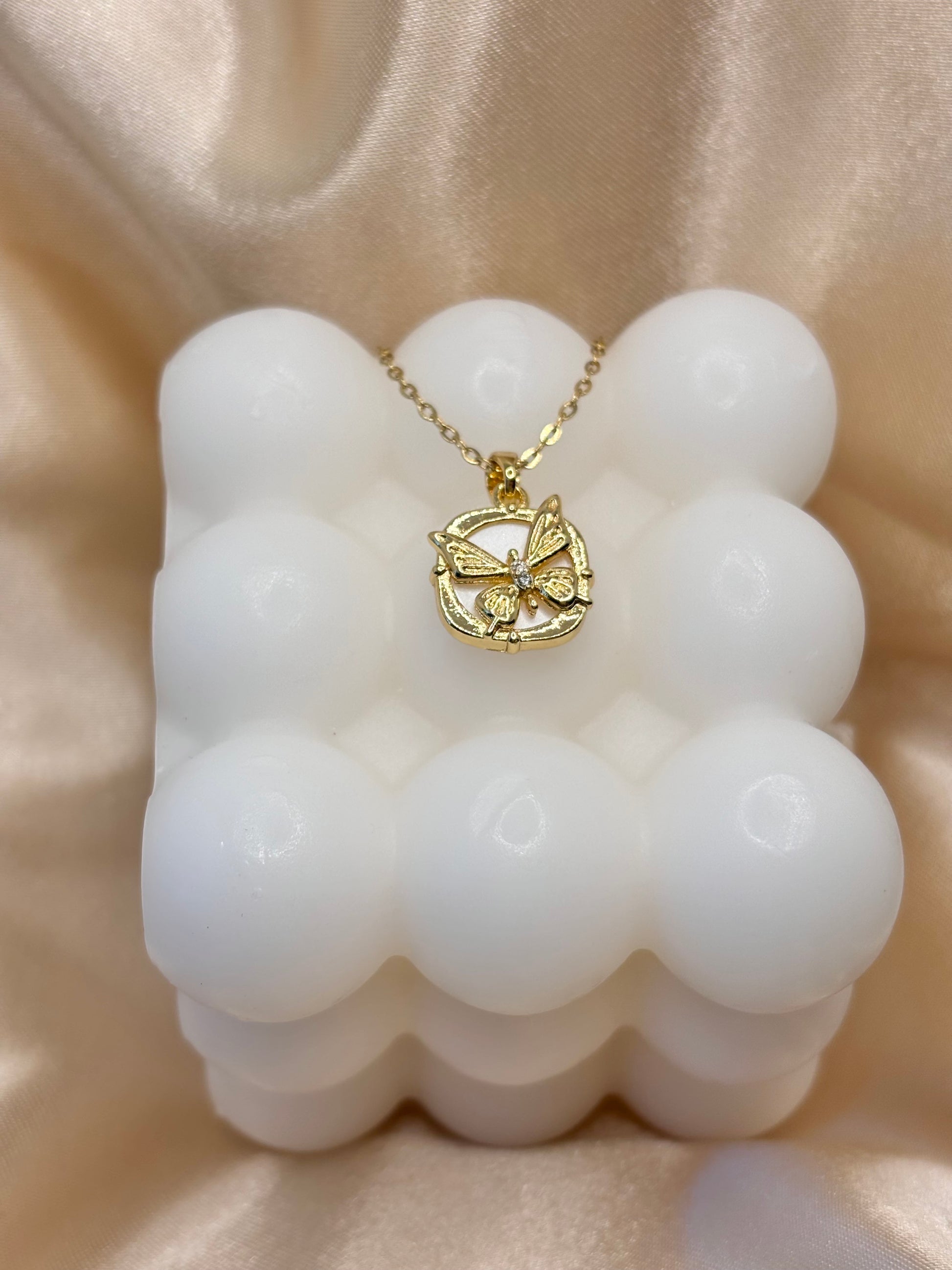 Our gorgeous '' Mariposa Butterfly Pendant and Necklace '' made with 18K Gold coating, stainless steel, imitation pearl (shell) and Cubic Zirconia diamonds.